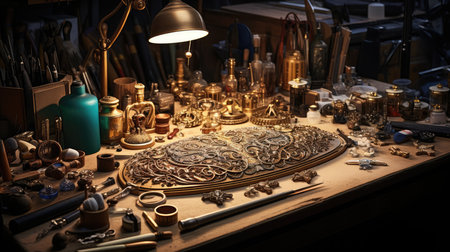 A vintage artisan workspace showcasing various jewelry tools and elegant designs on a rustic wooden table, embodying creativity and craftsmanship for inspired artists.
