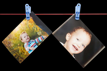 Close-up of man holding in the hand printed photos with picture of young couple. Concepts of happy memories, romantic and love