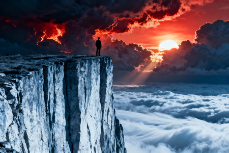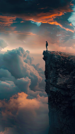 A man stands on a cliff overlooking a vast, cloudy sky. Concept of solitude and contemplation, as the man gazes out into the distance. The clouds above him seem to mirror his thoughts