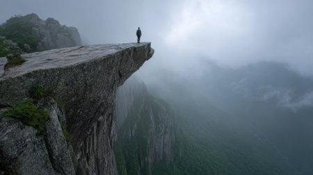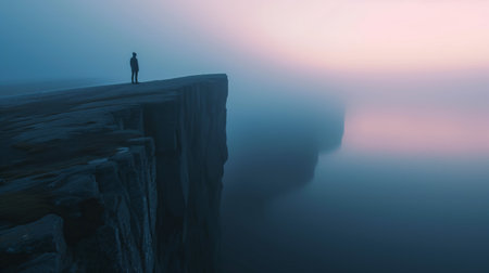 Person on cliff edge, silhouette style, misty background, concept of solitude