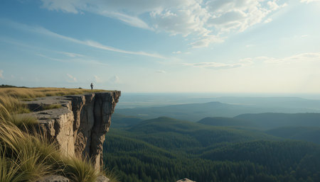 A person stands on a cliff overlooking a forest. The sky is cloudy and the trees are lush and green. Concept of solitude and awe, as the person takes in the beauty of the natural surroundings