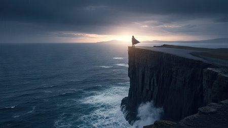 An AI generated illustration of a solitary figure standing at the edge of a cliff overlooking the sea at dawn