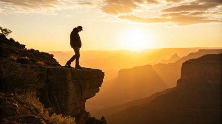 AI Generated. Silhouette of a person standing on a cliff edge at sunrise