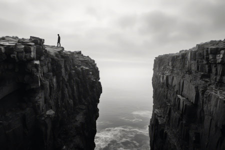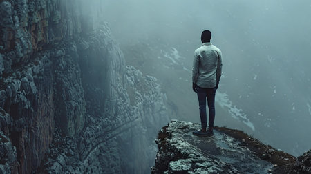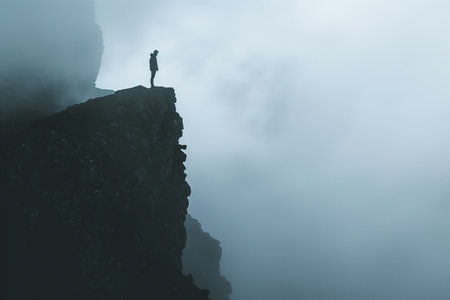 A lone individual is seen in silhouette at the edge of a stark cliff shrouded in dense fog, evoking feelings of isolation, introspection, and the overwhelming force of nature.