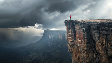 A man experiences depression and despair, he stands on the gloomy edge of a cliff, mental illness and loneliness, AI generated image