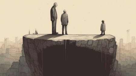 Two figures on cliffs face each other, symbolizing tension against a cloudy backdrop
