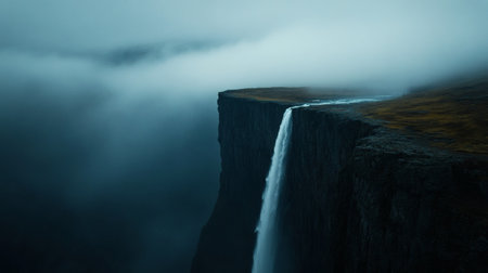 Water cascades dramatically from a sheer cliff into a swirling mist below, surrounded by rugged terrain under a moody sky. Nature's power and beauty are on full display.