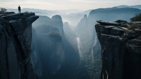 Person on cliff edge, silhouette style, misty background, concept of solitude