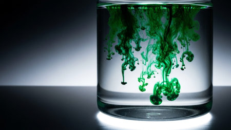 Dissolution and spread of a green substance in a flask with a clear liquid. Chemical reaction observed in the lab.. Copyspace.