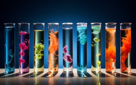 close-up of test tubes with colorful chemical liquids, created with generative ai