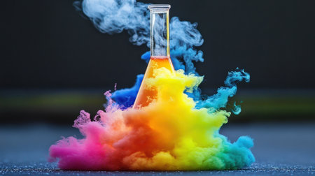 A stunning laboratory scene depicting colorful smoke billowing from a flask, illustrating a captivating chemical reaction filled with vibrant colors and creativity.