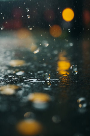 Raindrops on wet asphalt with bokeh background, shallow depth of field