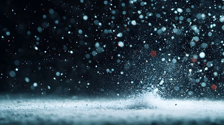Snowflakes swirl gracefully in the wind, creating a mesmerizing winter scene. A dark backdrop enhances the snowy textures, evoking a magical atmosphere of cold serenity.