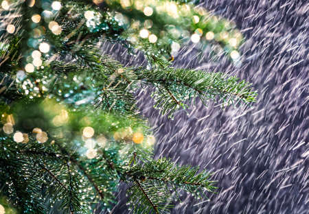 Spruce fir tree branch under a heavy rain shower with waterdrops in the golden rays of the sun in summer. Fresh rainy summer background. Rain and sun.