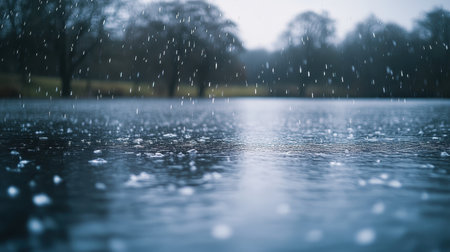A rainy day with a lot of raindrops falling from the sky. The raindrops are scattered all over the ground, creating a wet and gloomy atmosphere. The scene is captured in black and white