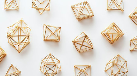 Overhead shot of golden geometric decor on white background, minimalist style for upscale branding.