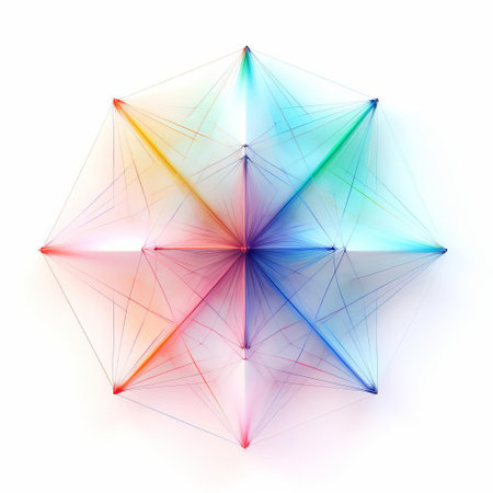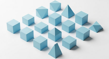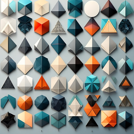 Colorful 3D geometric shapes arranged in a circular pattern on a light background, showcasing vibrant hues and sharp angles