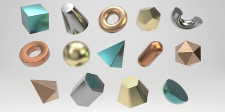 3d render primitives composition. Shapes in motion isolated on white background for trendy designs. Spheres, torus, tubes, cones, pyramid, cube in metallic turquoise and gold colors.