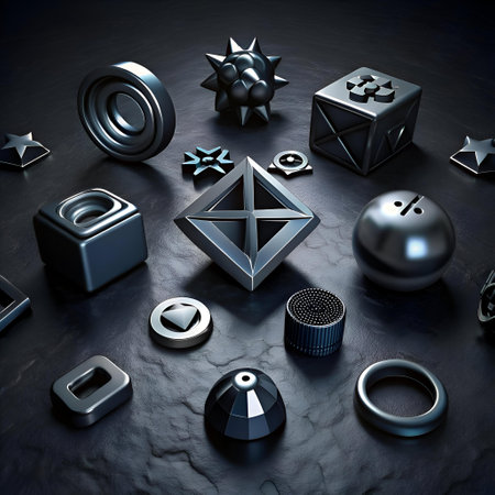 A collection of matte gray geometric shapes including spheres, cubes, triangles, and rings are arranged in a balanced composition with soft studio lighting casting...