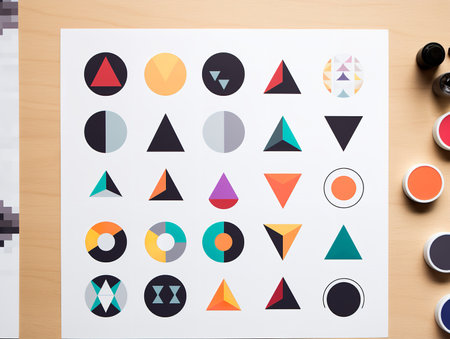 A collection of geometric shapes including circles, triangles, and layered forms displayed on a light background, emphasizing bold patterns and contrasts.