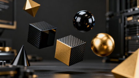 Abstract 3d rendering of black cubes and golden spheres on black background.