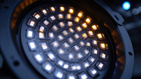 Professional orange studio spotlight hanging on the ceiling. Lighted dust particles and lens flares.