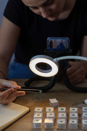 Gemologist working taking photos of precious emerald stones with her mobile phone. Work space.
