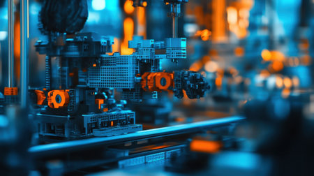 This image showcases a detailed view of intricate machinery in a modern industrial environment, featuring dynamic orange highlights against a cool blue background.