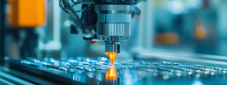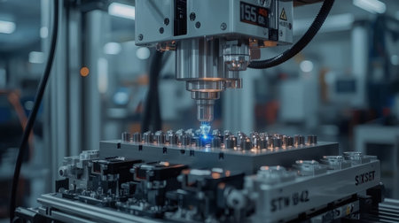 Close up of a CNC laser machining metal parts in a production facility. Cool ambient lighting and selective focus highlight precision engineering and industrial automation.