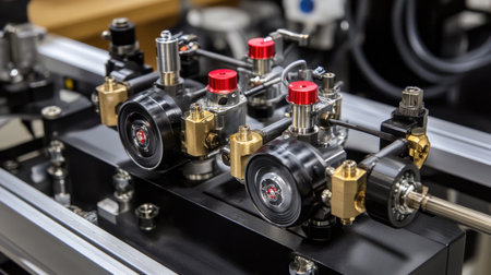 High-quality close-up image showcasing modern metallic equipment with intricate valve and pipe connections, set in an industrial environment.