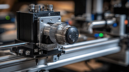 This image captures a high-resolution close-up of a precision industrial camera mounted on advanced machinery in a modern manufacturing facility, showcasing intricate details.