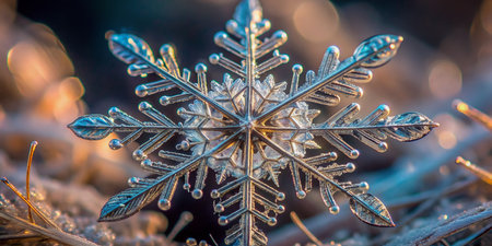A macro shot of a single delicate snowflake, perfectly crystalline in its intricate structure
