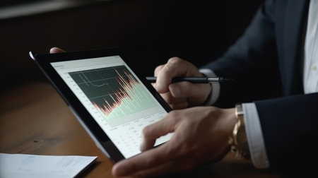 Businessman analyzing investment charts with tablet computer. Business analysis and strategy concept. Generative AI