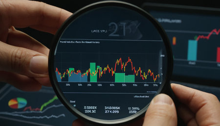 A close-up view presents a magnifying glass positioned over data charts, set against a dark background. The image features golden accents and sharp details. Suitable for illustrating analysis, research, and technical reports. This composition is adaptable for commercial and editorial purposes.