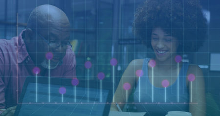 Collaborating colleagues analyzing data on laptop at office desk, with notebook and chart overlay. Professional, teamwork, innovation, communication, productivity, modern, workspace
