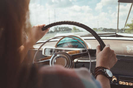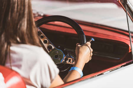 Woman driving a retro classic car for road trip and travel.