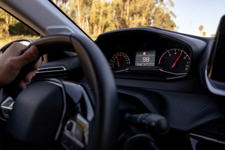 Driver's hands on a steering wheel of and car dashboard.