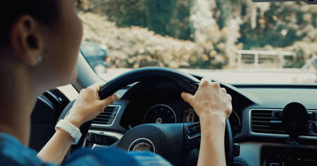 Beautiful Asian woman driving on the road, back view.