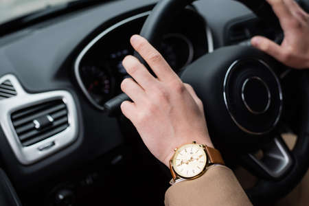 cropped view of man with wristwatch driving car