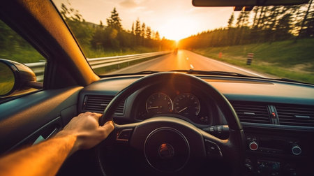 Generative AI, a summer road trip, a man holding the driving wheel, and the setting sun