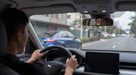 Man driving a car and looking through a rear view mirror on the road