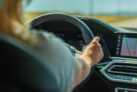 Haarlem, Netherlands - Aug 15, 2018: Wide image of caucasian woman driving luxury car on Dutch six lane highway with GPS instruction on the dashboard