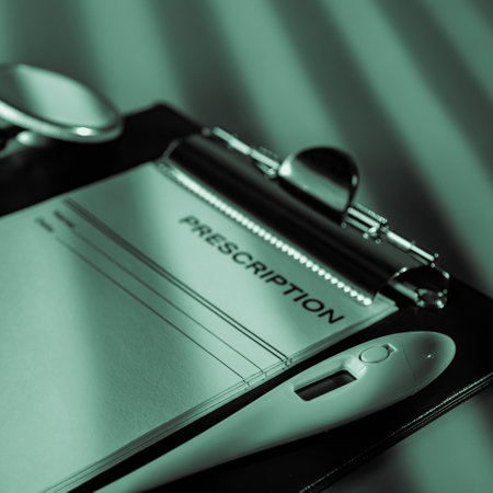 Medical rx prescription with stethoscope and thermometer on gray background monochrome with green tinting