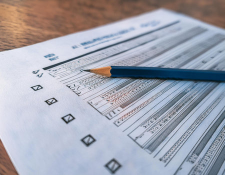 Close up depiction of test and examination materials featuring elements like a pencil, paper, and checkmarks representing assessment, education, and evaluation. Ideal for topics related to exams, testing, and academic performance.
