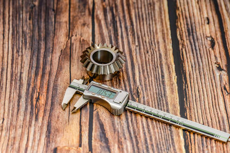 Bevel gear and vernier caliper on wooden background, gear cutting
