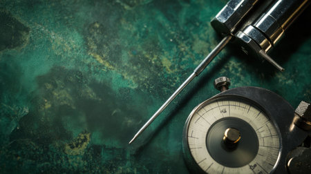 A captivating close-up view of precision measurement tools, including a compass and syringe, resting on a rich dark green textured surface.