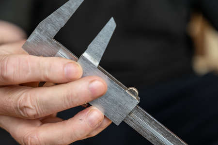 A man's hand holding a caliper. An adult man with a high-precision metal instrument for measuring the external and internal dimensions of objects and the depths