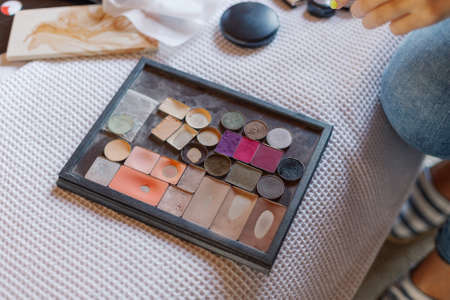 Professional multi-colored eye shadow for makeup. Makeup artist begins his work.