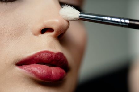 makeup, brushes, closeup. Backstage makeup artist work. Makeup stylist.