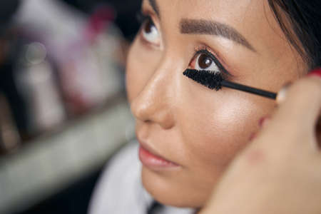 Close-up portrait. Process of making makeup. A professional make-up artist paints eyelashes models in the studio.
